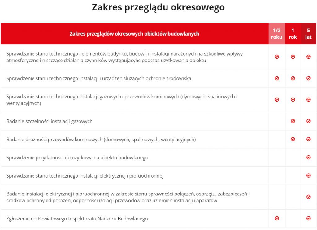 Pięcioletni przegląd budowlany, polega na sprawdzeniu stanu technicznego oraz przydatności do użytkowania:
